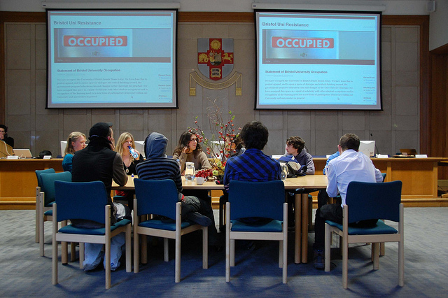 In the very same winter, in line with this conjuncture, a group of students occupied the University of Bristol’s (UoB) Senate Room, the meeting place of the University’s principal academic decision-making body. The same group of occupiers had previously occupied their Students’ Union; part of a successful campaign to call an emergency general meeting by a thus far unsupportive Union officer team. At the emergency general meeting, by an overwhelming majority, resolutions were passed to the effect that the Union had to offer its total backing to efforts to resist austerity measures and the rise in fees. The Senate Room occupation was the next step.